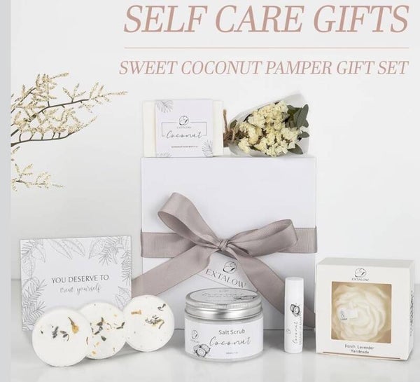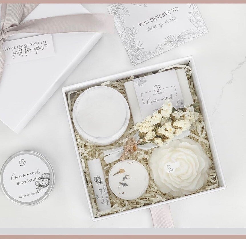 Regalos de spa hechos a mano para mujeres: la caja de regalo EXTALOW Coconut Spa tiene todo lo que una mujer necesita. Incluye barra de jabón hecha a mano de coco, exfoliante corporal, bálsamo labial, vela en forma de flor, 4 vaporizadores de ducha de lavanda, mini ramo seco y una tarjeta de regalo. Embalado en una elegante caja de regalo con lazo.